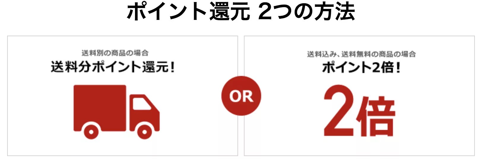 楽天プレミアムのサービスとして注目に値するのが、送料分ポイント還元または送料込み・送料無料の場合はポイントが2倍になるサービスです。
